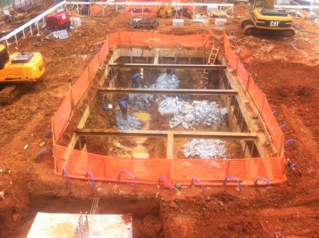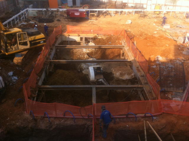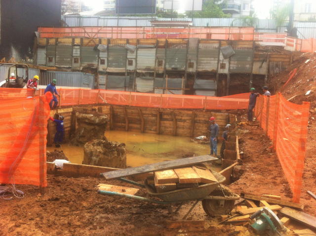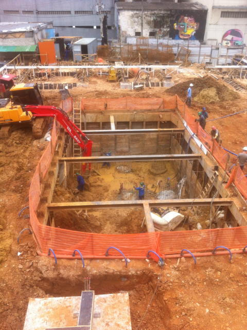 | - Foto em 25/09/2015 - Travamento e rebaixamento instalados, e escavando o poço do elevador | |