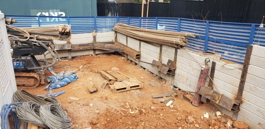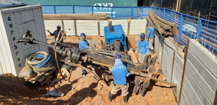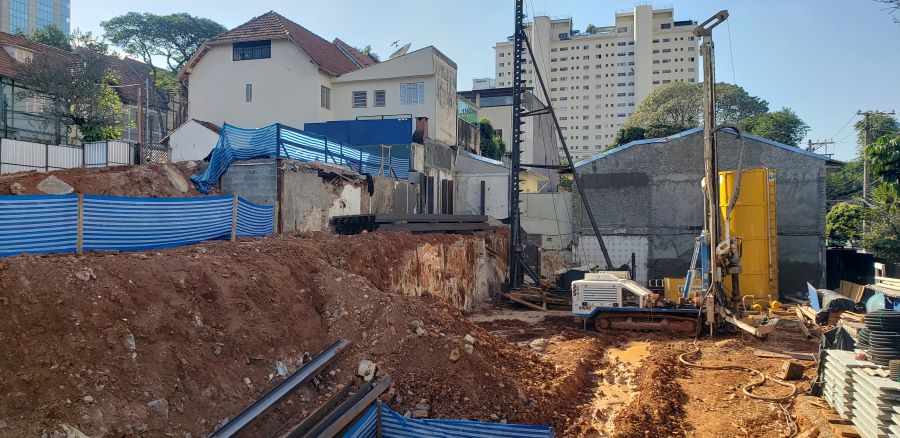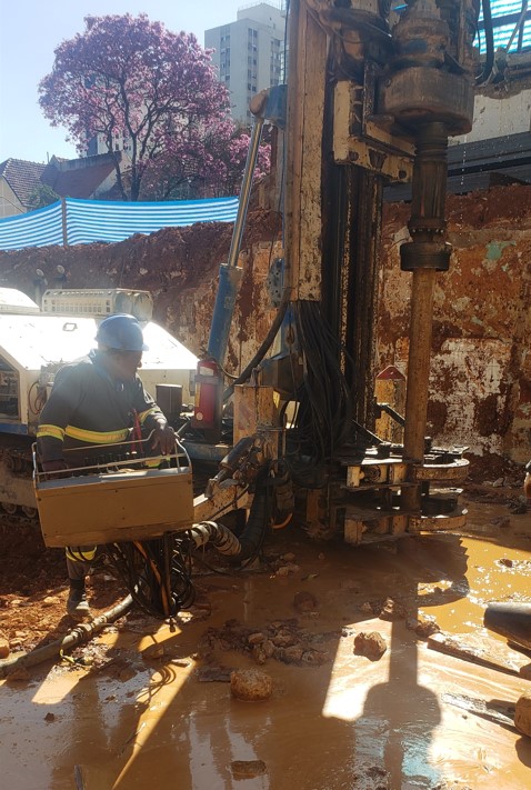 | - Foto em 10/07/2023 - Perfuração dos tirantes na cortina provisória em perfis metálicos. | |