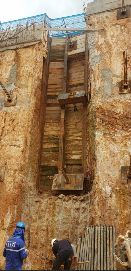 | - Foto em 15/01/2024 - Nichos na parede diafragma para a execução das vigas de transição, escavação geral em andamento. | |