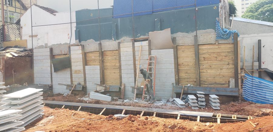 | - Foto em 22/05/2023 - Preparação da mureta guia da parede diafragma. | |