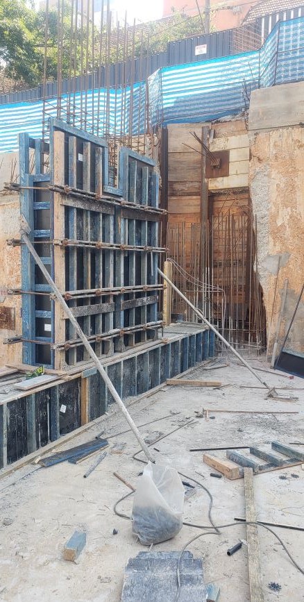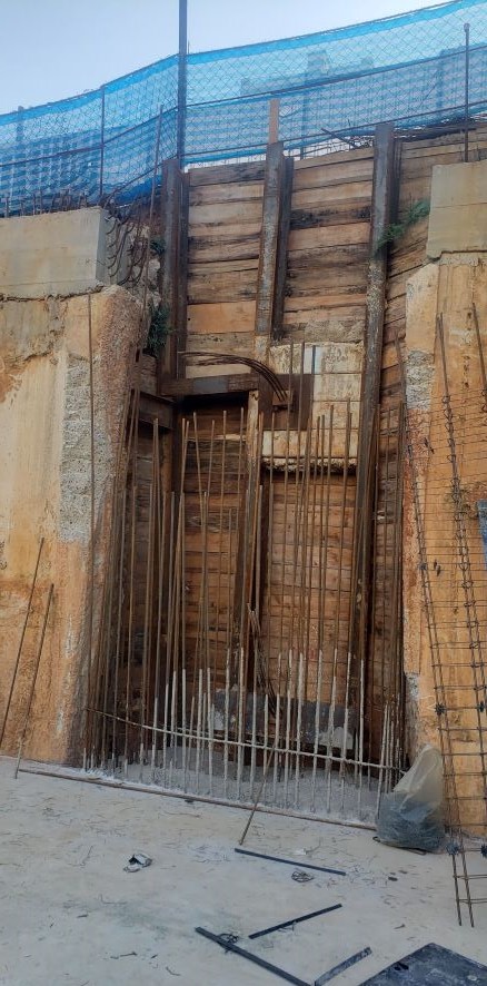 | - Foto em 21/12/2023 - Trecho da parede diafragma com arrasamento para as vigas de transição, já atirantado, e sendo prancheado. | |