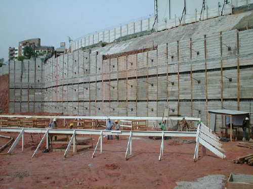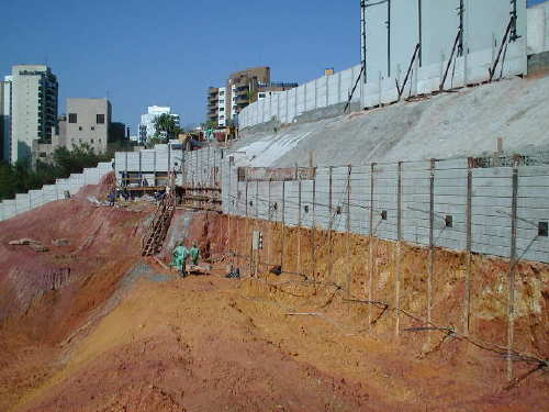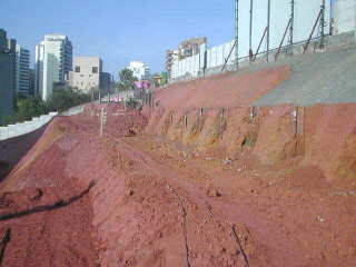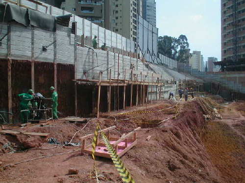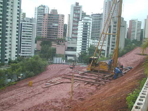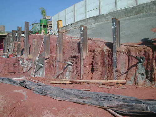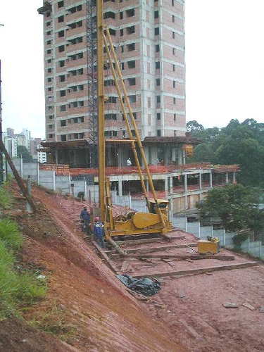 | - Foto em 01/08/05 - Execução da 1a.linha de tirantes. | |