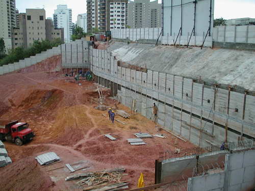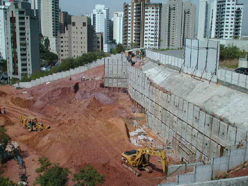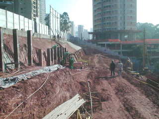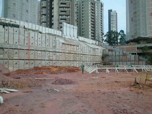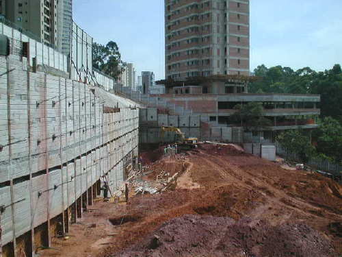 | - Foto em 25/10/05 - Cortina concluída. Início das fundações em tubulão a céu aberto. | |