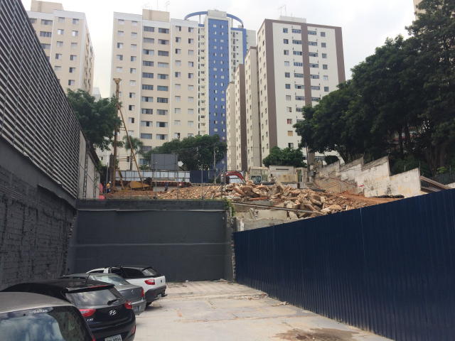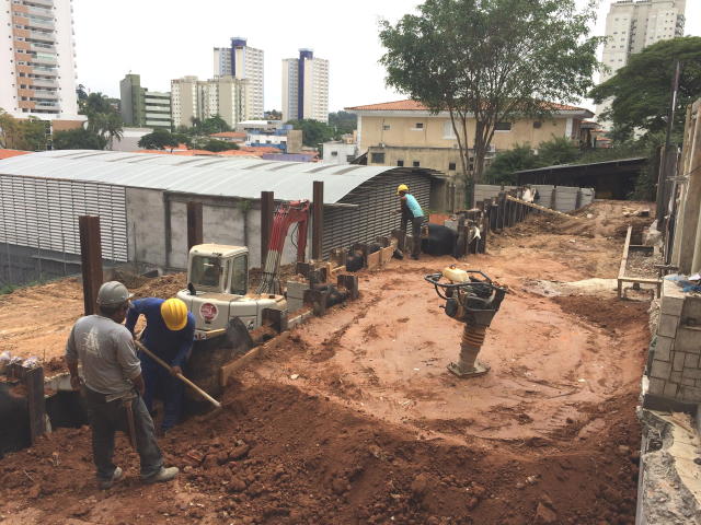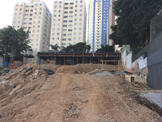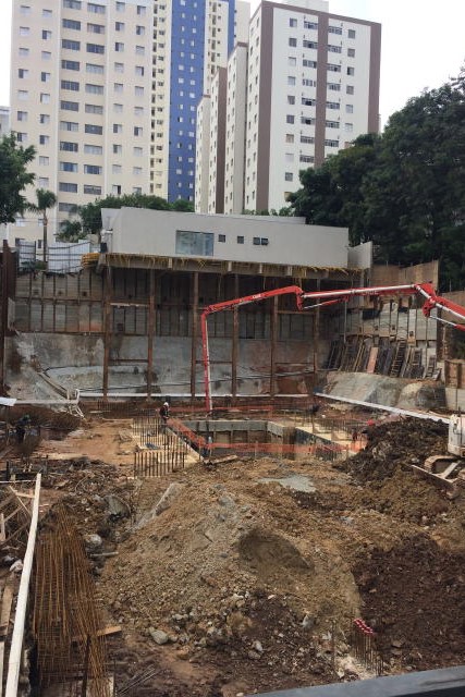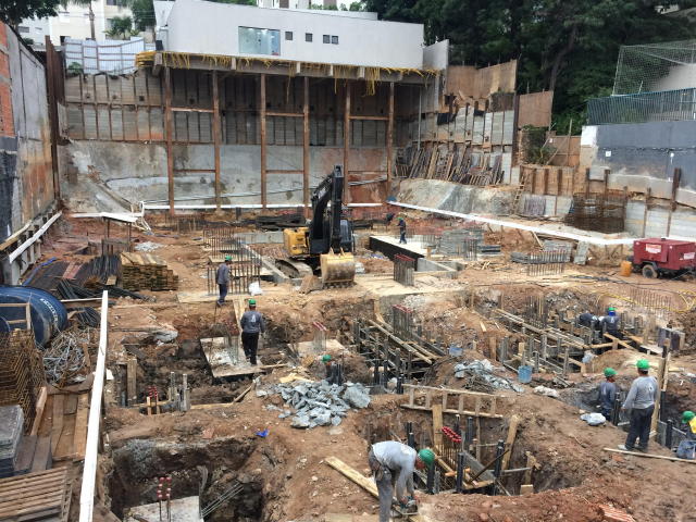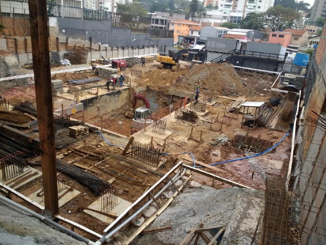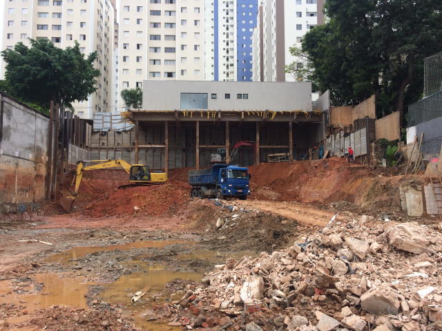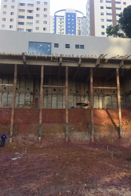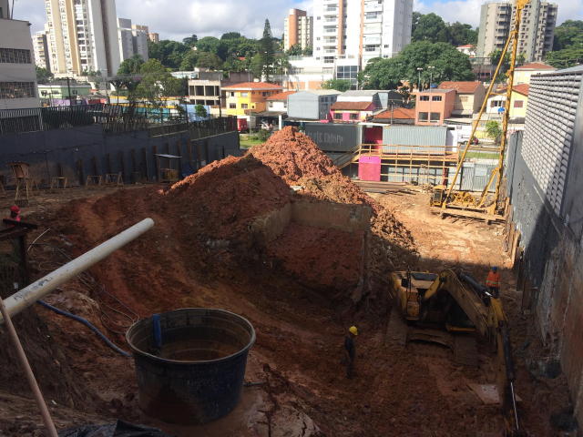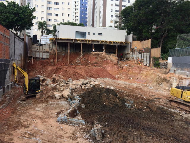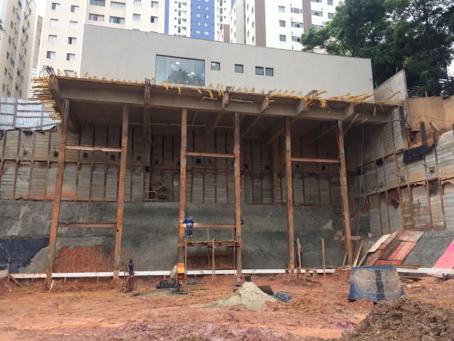 | - Foto em 28/02/2018 - Escavação geral em andamento, e plaqueamento da cortina dos fundos. | |