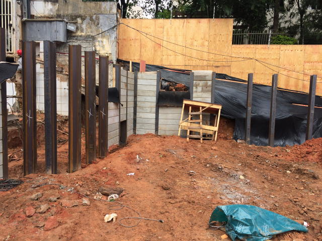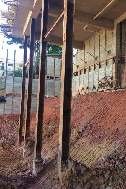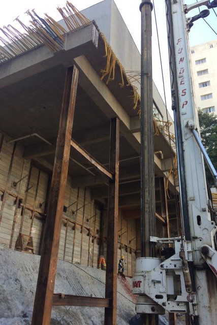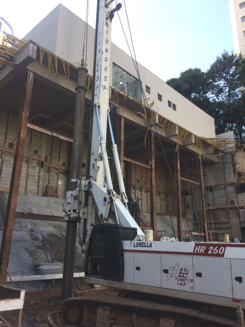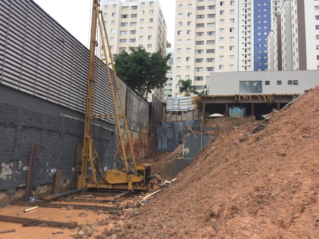 | - Foto em 25/04/2018 - Cravação das contenções para os blocos do Elevador - Escada. | |