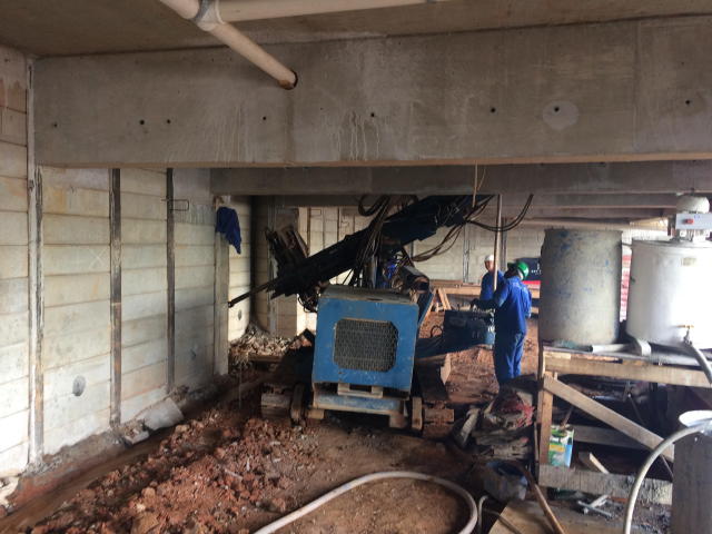| - Foto em 05/02/2018 - Atirantamento da cortina sob o stand de vendas (trecho da laje do Térreo) | |