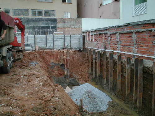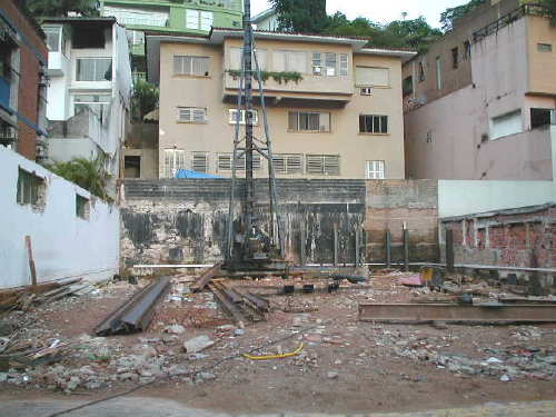 | - Foto em 25/10/05 - Cravando perfis metálicos nos fundos. | |