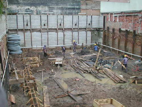 | - Foto em 24/01/06 - Obra escavada. Formas da fundação em andamento. | |