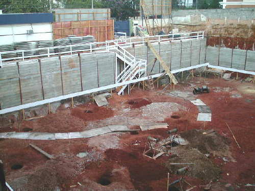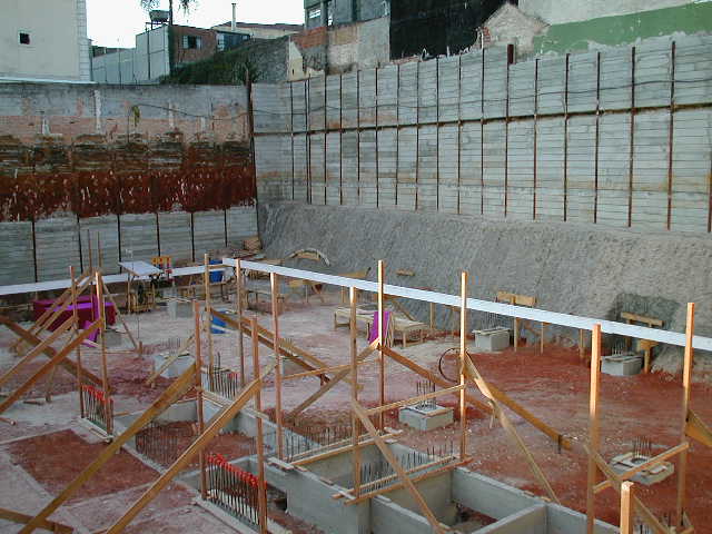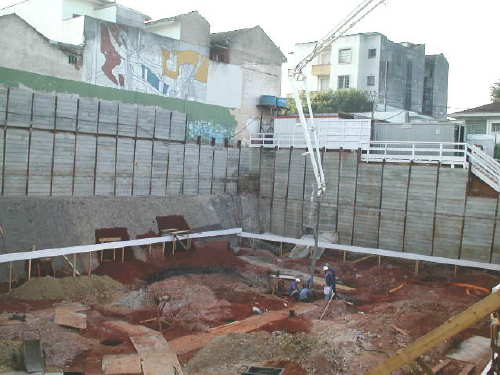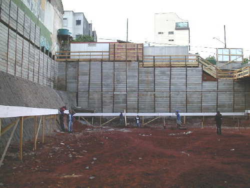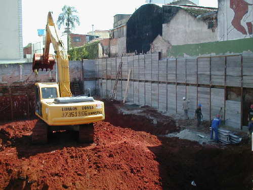 Foto em 19/04/02 - Montagem das cortinas laterais, e escavação