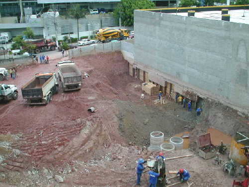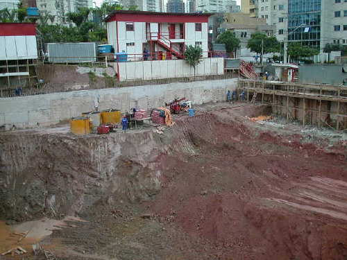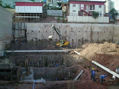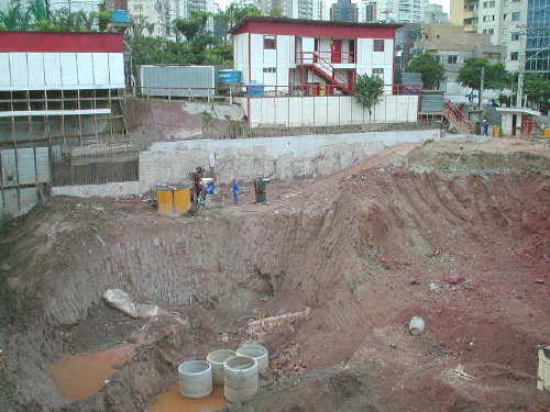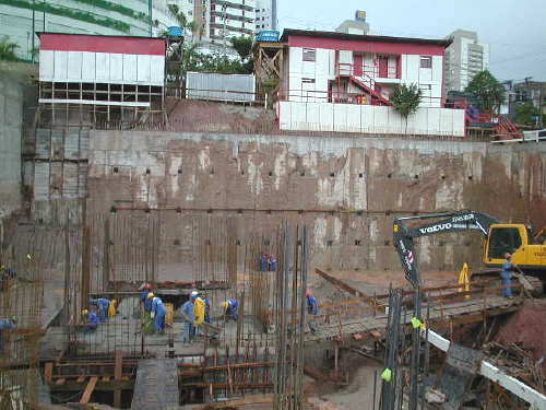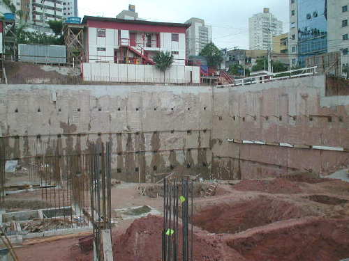 | - Foto em 17/03/06 - Escavação para a 3a.linha de ancoragens, e sapatas sendo executadas. | |