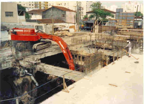 - Obra executada com parede diafragma, sem tirantes. Sequencia executiva : 1) Execução da parede diafragma foi executada. 2) Pilares centrais do prédio, executados em estacas tipo barrete, com perfis metálicos implantados. 3) Concretagem da laje do Térreo sobre os perfis implantados. 4) Escavação dos 4 sub-solos, e concretagem das respectivas lajes e pilares da estrutura. |