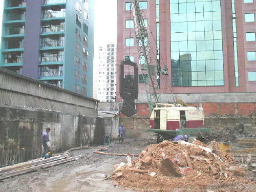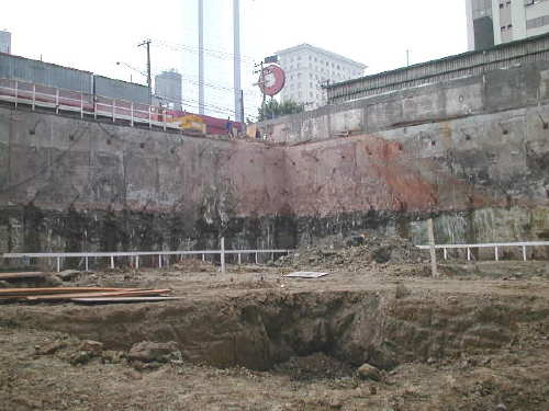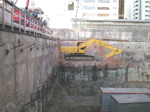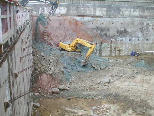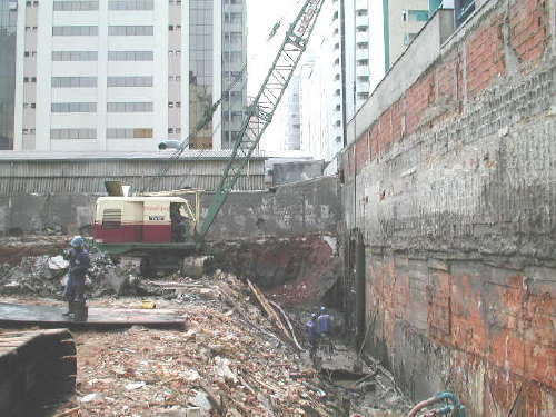 | - Foto em 15/05/03 - Concluída a segunda linha de tirantes. Iniciando escavação até o 3o.Sub-Solo. | |