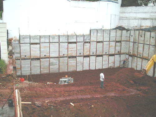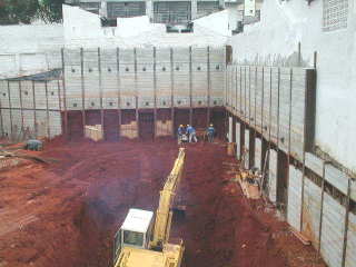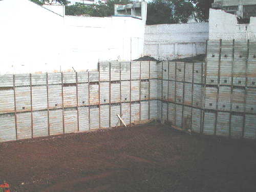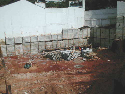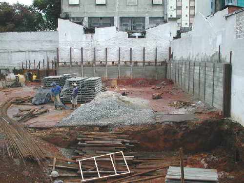 | - Foto em 03/02/05 - Trecho de cortina dos fundos e lateral direita concretados. | |