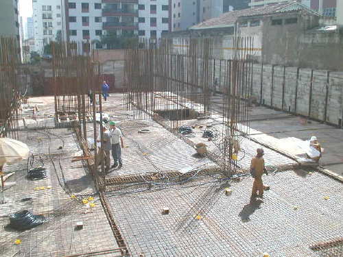 | - Foto em 07/06/04 - Armação da laje do Térreo em andamento. | ||