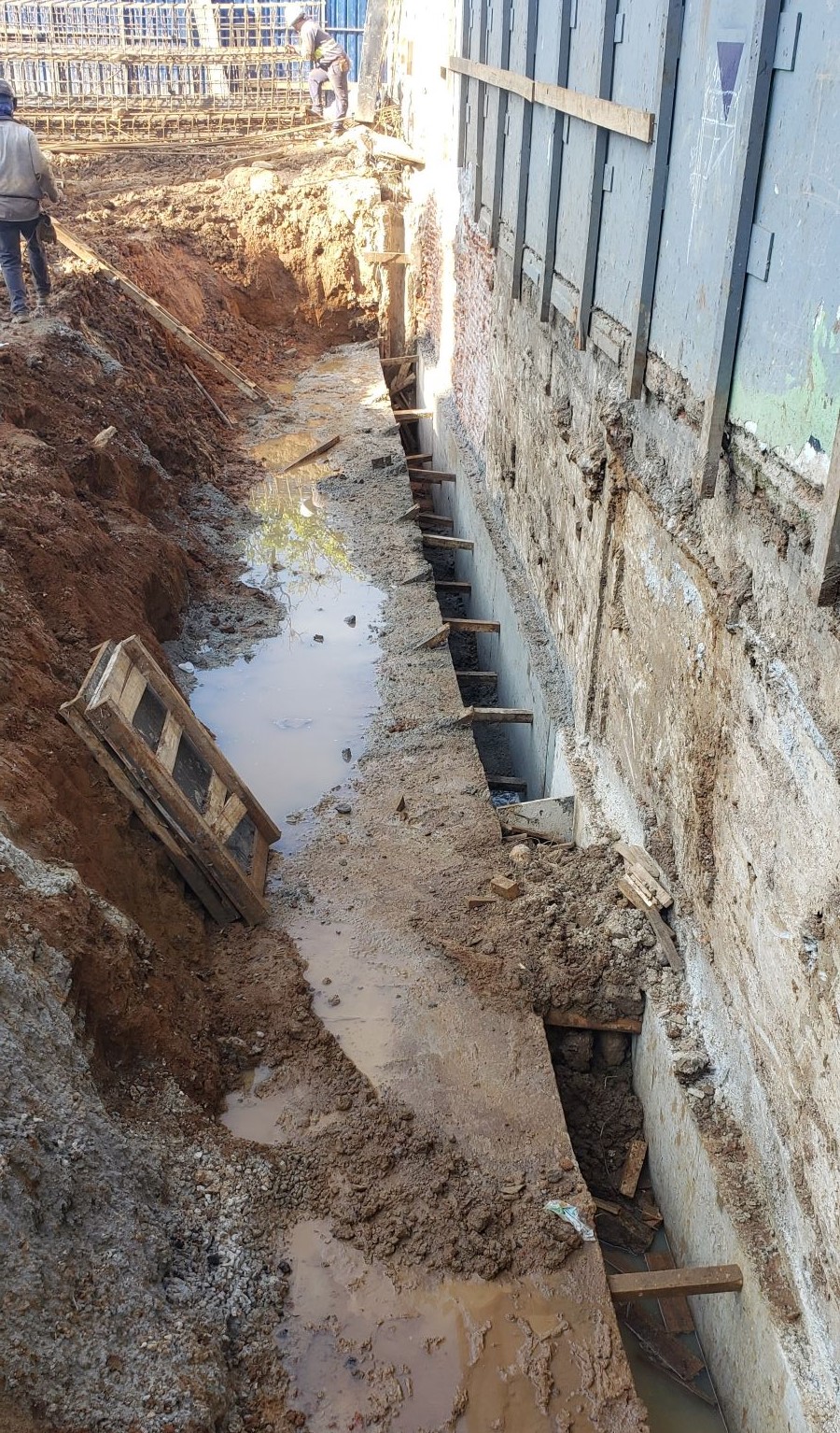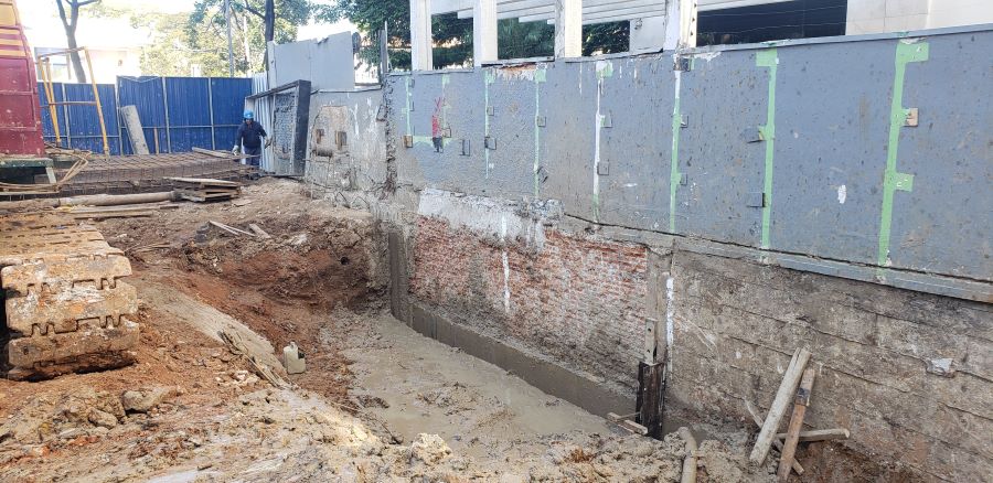 | - Foto em 04/07/2023 - Execução da parede diafragfma junto ao vizinho esquerdo (edifício com 1 subsolo). | |