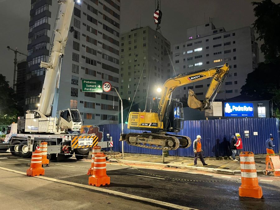 | - Foto em 21/07/2023 - Perfuração e instalação da 1a. linha de tirantes junto a Av.Rebouças (sobre o túnel do Metrô). | |