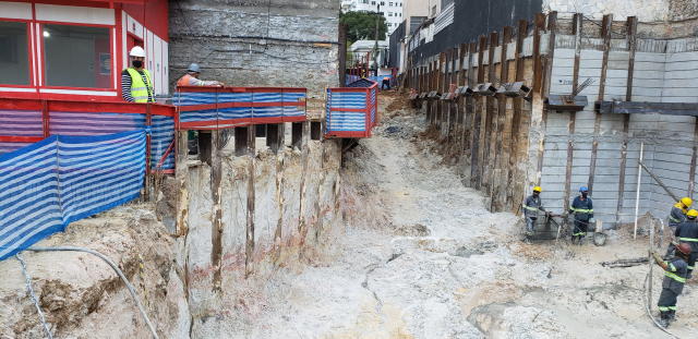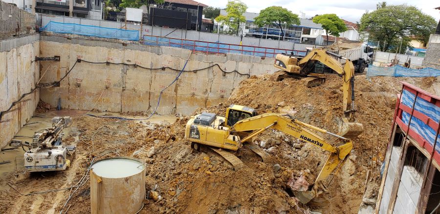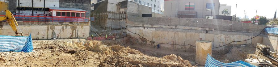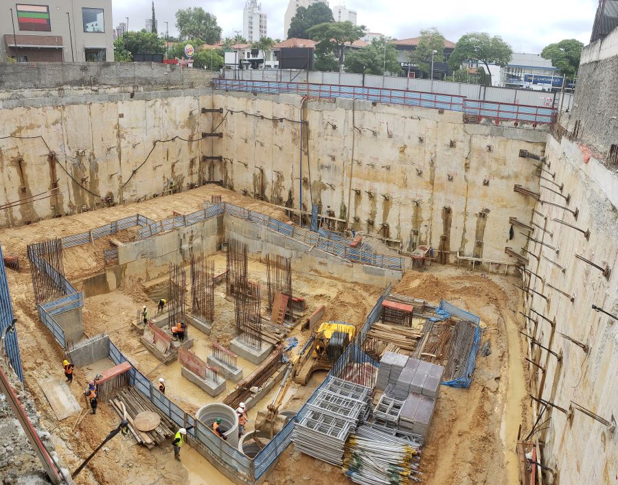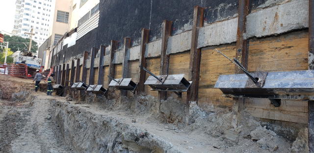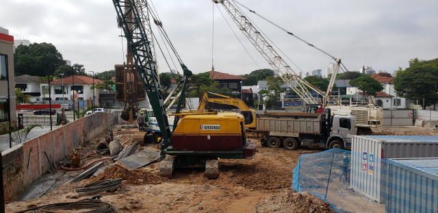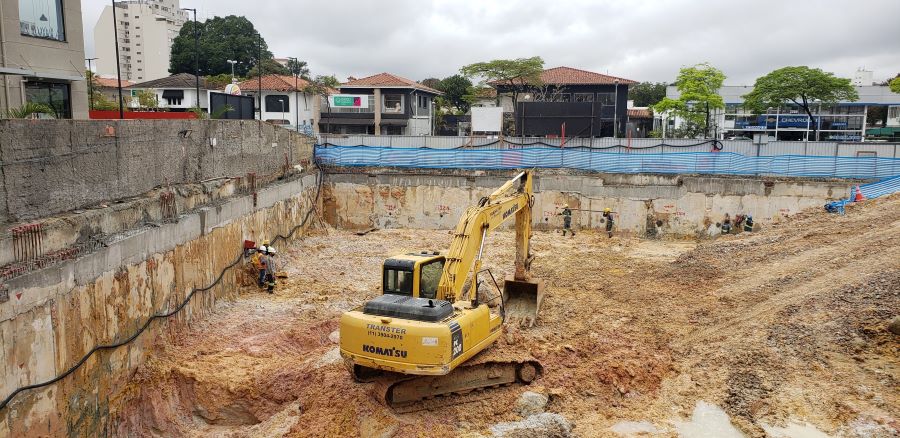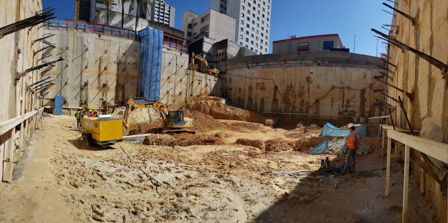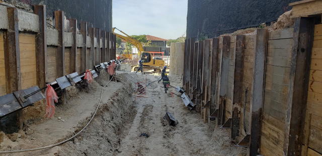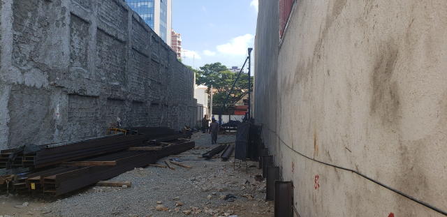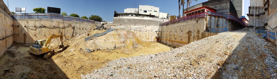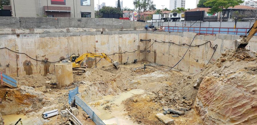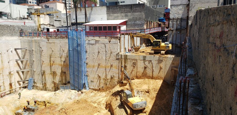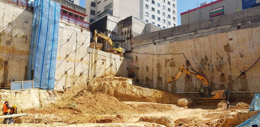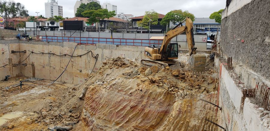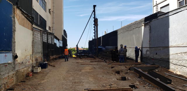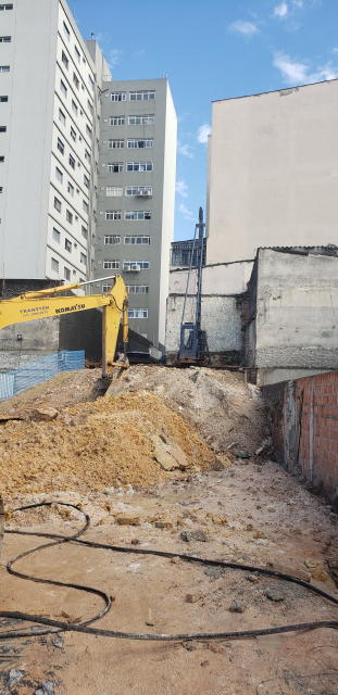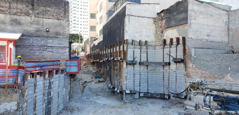 | - Foto em 30/07/2020 - Escavação para a 1a. linha de tirantes junto a parede diafragma nos fundos na Av.Rebouças. | |
