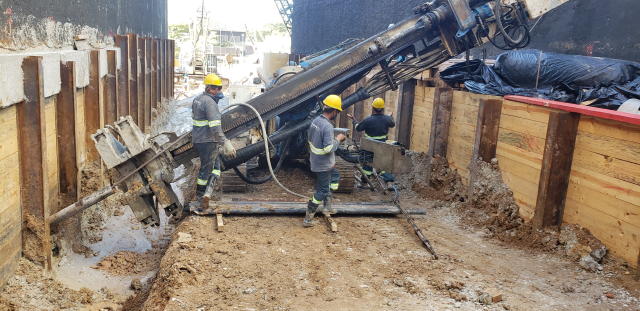 | - Foto em 10/08/2020 - Execução da 2a. linha de tirantes. | |