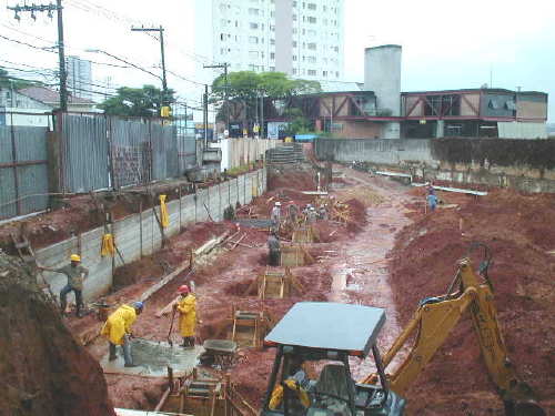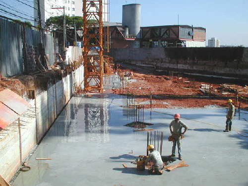 | - Foto em 20/01/05 - Montando cortina no recuo, e preparando blocos sobre tubulões. | |