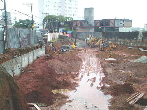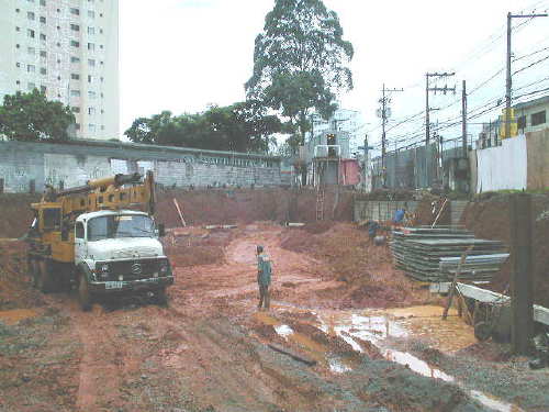 | - Foto em 11/01/05 - Cravação de perfis concluída, e escavando tubulões. | |