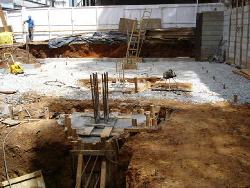 | - Foto em 05/11/04 - Detalhe dos blocos e preparação do piso do sub-solo. | |