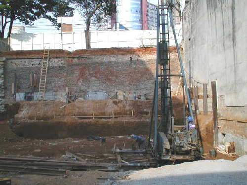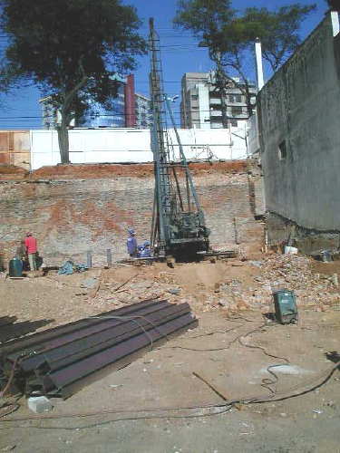 | - Foto em 02/09/04 - Início da cravação dos perfis metálicos na periferia. | |