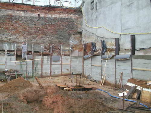 | - Foto em 29/09/04 - Cravando trilhos metálicos do corpo do prédio. | |