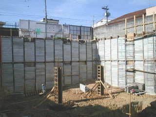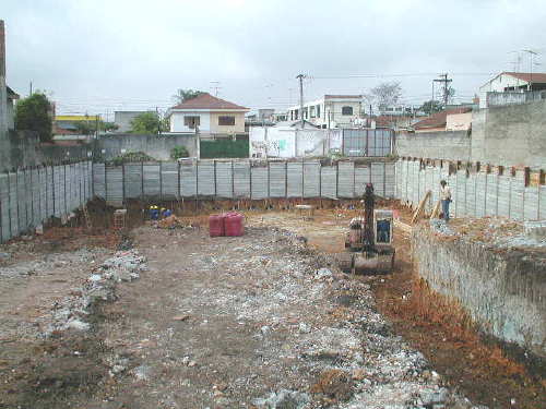 | - Foto em 09/09/04 - Iniciando escavação e montagem das cortinas com placas no 1o.sub-solo. | |