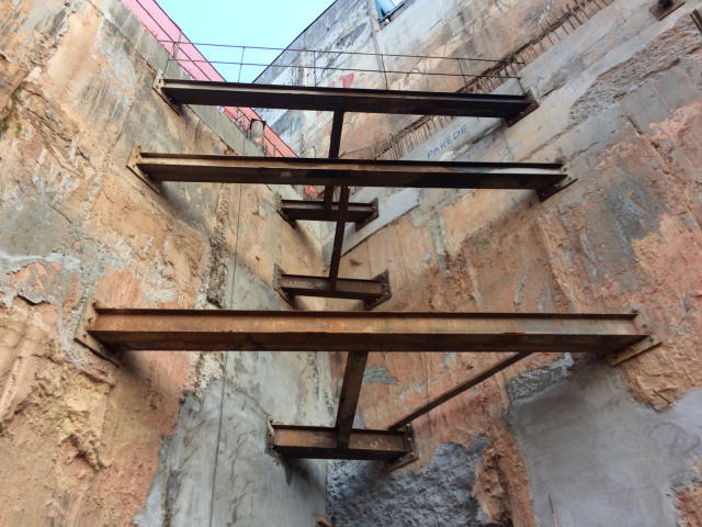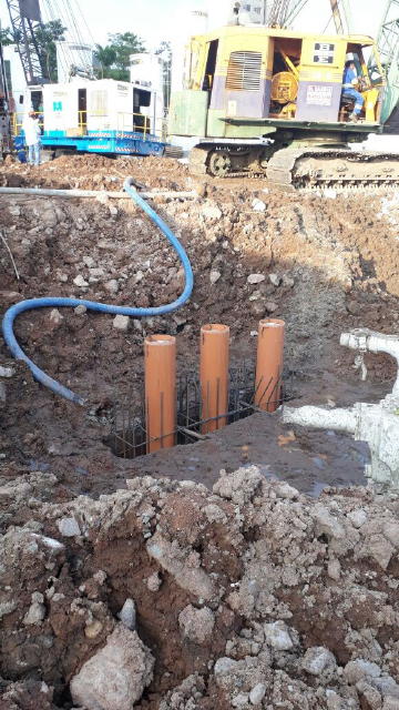 | - Foto em 09/05/2018 - Execução das estacas raiz nos barretes de fundação. | |