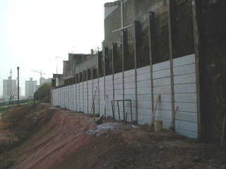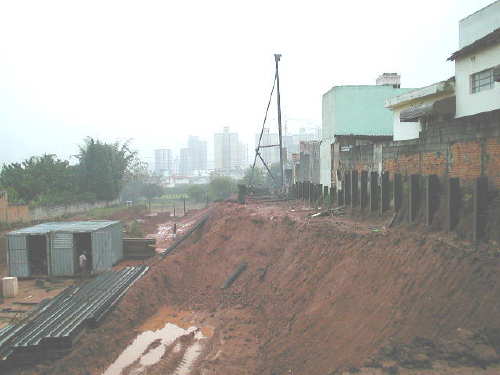 | - Foto em 03/06/04 - Cravando perfis metálicos na lateral direita. | |