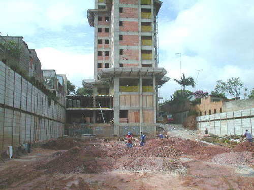 | - Foto em 03/02/05 - Vista do Bloco A, e cortinas laterais concluídas. | |