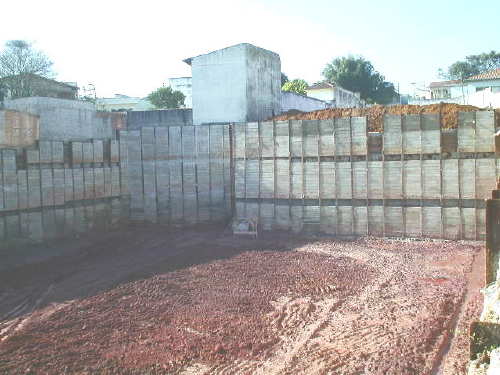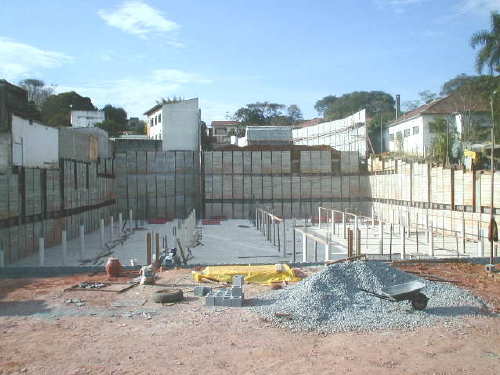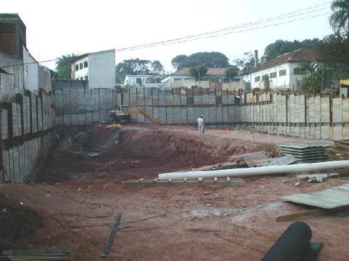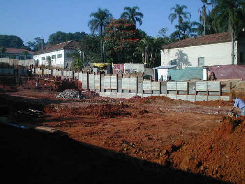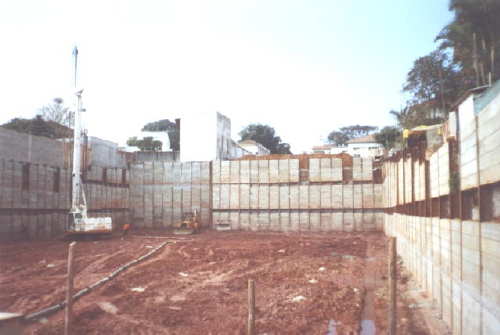 | - Foto em 30/04/02 - Escavação com simultânea execução das cortinas de divisa |