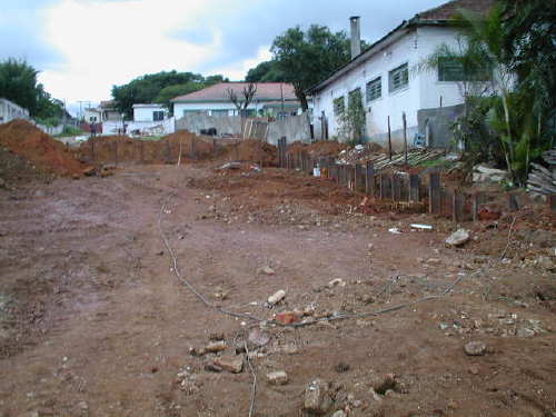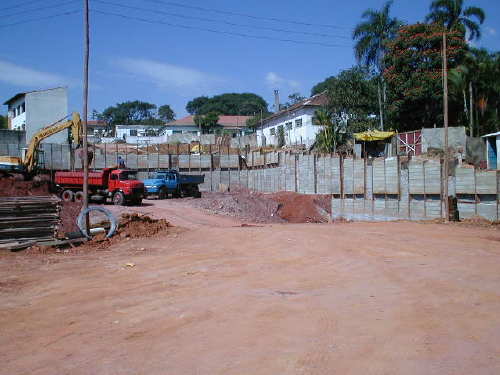 | - Foto em 12/04/02 - Escavação e execução das cortinas laterais |