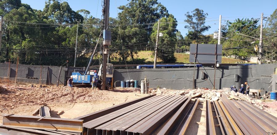 | - Foto em 20/04/2022 - Cravação dos perfis metálicos para as cortinas de contenção. | |